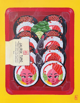 Part of my ongoing sushi series, this piece takes an artistic approach to sushi presentation. The Salroe Twins represent my love for sushi through a creative lens - featuring sushi rolls arranged in a container with soy sauce and wasabi, complete with expressive faces. This work explores the visual appeal and cultural significance of sushi from a different angle, celebrating both the food itself and the experience of sharing it with others.